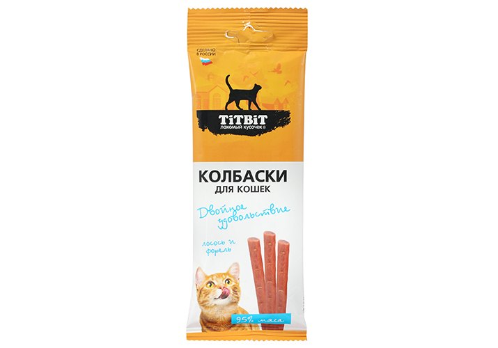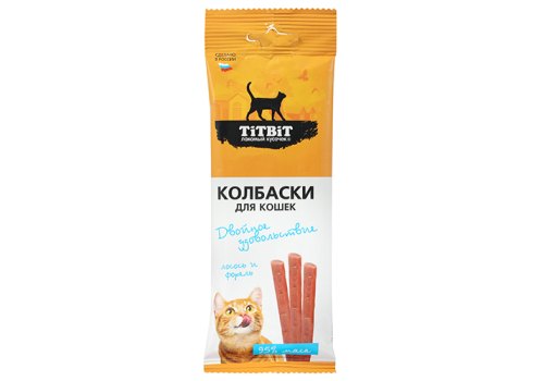 Titbit Двойное удовольствие Лакомство Титбит для кошек Колбаски Лосось и форель 45 г