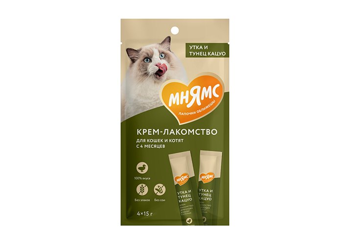 Крем-лакомство «Мнямс» с уткой и тунцом "Кацуо" – это излюбленное кошками угощение с нежнейшей кремовой текстурой.