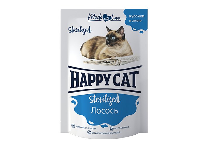 Happy Cat Sterilized Паучи Хэппи Кэт для Стерилизованных кошек Лосось кусочки в желе (цена за упаковку, Россия) 85г х 24шт