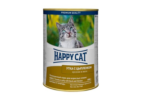 Happy Cat Консервы Хэппи Кэт для кошек кусочки в Желе Утка и Цыпленок (цена за упаковку) 400г x 12шт