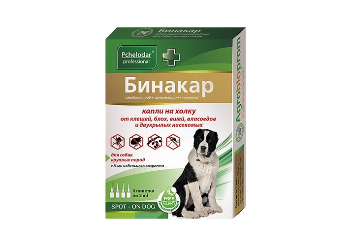 Pchelodar Бинакар капли на холку от блох вшей и власоедов для собак крупных пород 1пипетка на 20кг 2 мл / 4 пипетки