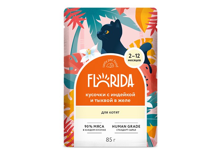 Florida Kitten Влажный корм Паучи Флорида для Котят Кусочки с Индейкой и тыквой в желе (цена за упаковку) 85г х 12шт