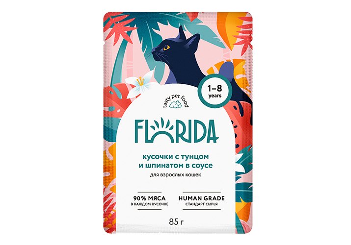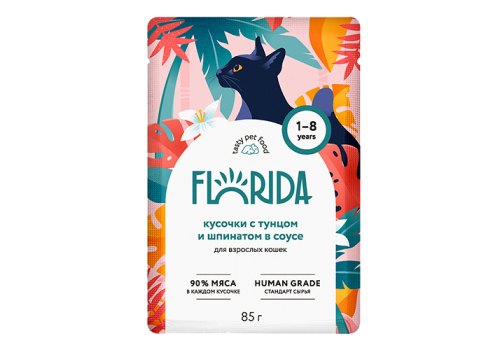 Florida Влажный корм Паучи Флорида для кошек Кусочки с Тунцом и шпинатом в соусе (цена за упаковку) 85г х 12шт