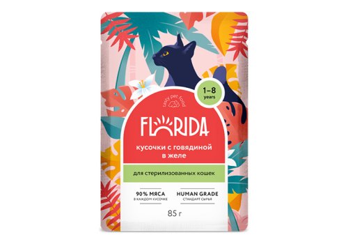 Florida Sterilized Влажный корм Паучи Флорида для Стерилизованных кошек Кусочки с Говядиной в желе (цена за упаковку) 85г х 12шт