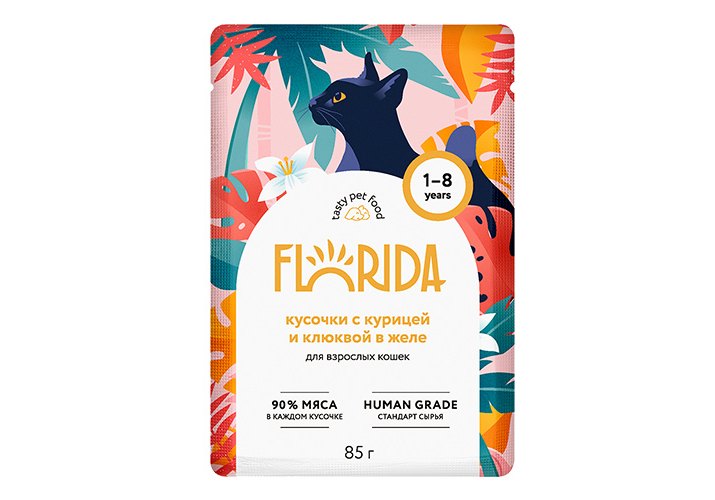 Florida Влажный корм Паучи Флорида для кошек Кусочки с Курицей и клюквой в желе (цена за упаковку) 85г х 12шт
