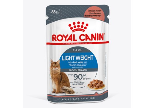 Корм консервированный полнорационный для взрослых кошек - Рекомендуется для профилактики лишнего веса. Сохранение кошкой веса, оптимального для ее возраста и породы – чрезвычайно важная, но иногда сложная задача. Однако Вам не придется снижать объем порций, чтобы вес кошки снизился, если Вы воспользуетесь продуктом, специально разработанным для этой цели с учетом меняющихся в период похудения потребностей животных. Корм ROYAL CANIN®Light Weight Care мелкие кусочки в соусе позволяет снизить спонтанное потребление калорий кошкой. Более 90%* животных достигли более здорового веса через 8 недель применения продукта. Продукт обогащен необходимыми питательными веществами, помогающими поддерживать обмен жиров. В период снижения веса огромное значение имеет сохранение мышечной массы кошки. Вот почему ROYAL CANIN®Light Weight Care мелкие кусочки в соусе отличается высоким содержанием белка: это помогает кошке поддерживать мышечную массу без повышения потребления калорий – а, следовательно, постоянно оставаться в хорошей физической форме. Продукт также содержит вещества, способствующие здоровью и нормальной работе мочевыделительной системы. Для удовлетворения индивидуальных предпочтений каждой кошки ROYAL CANIN®Light Weight Care выпускается также в виде сухого корма Light Weight Care. Если Вы выбрали для вашей кошки смешанное питание, следуйте нашим рекомендациям в рационных таблицах: это позволит смешивать сухой и влажный продукт в пропорциях, оптимальных для здоровья животного.