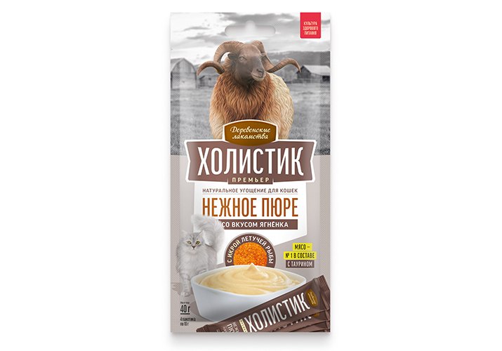 Деревенские лакомства Холистик Премьер Пюре для кошек со вкусом Ягненка с икрой летучей рыбы 10г х 4шт