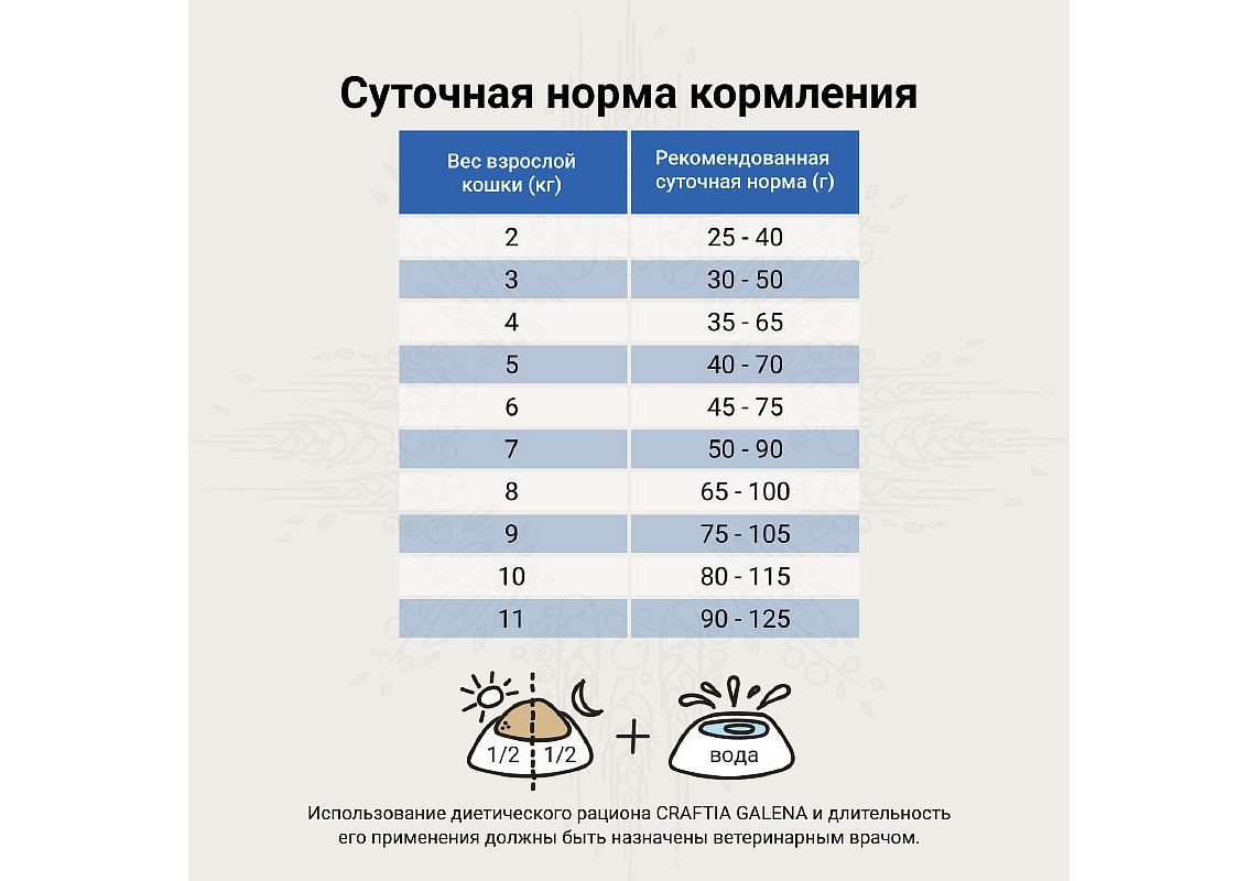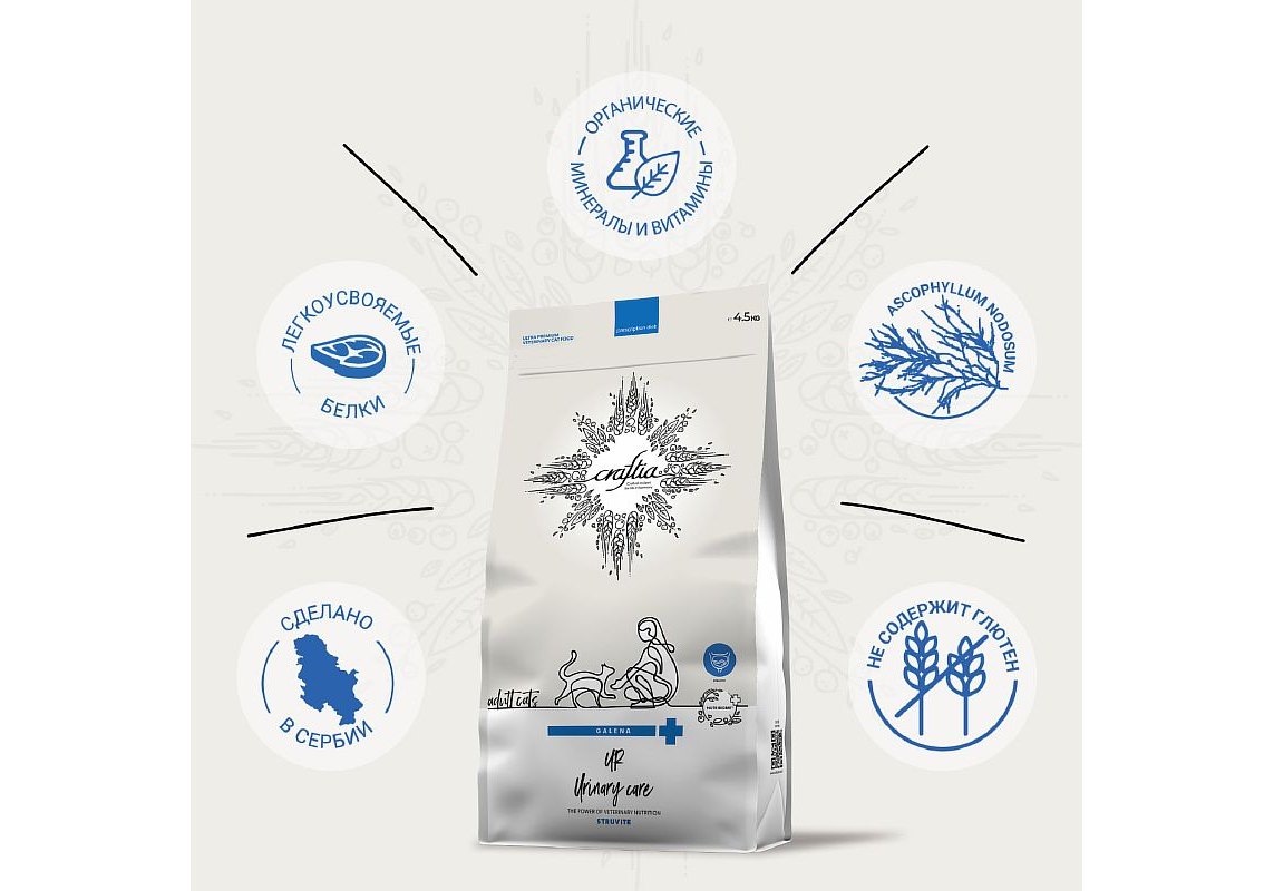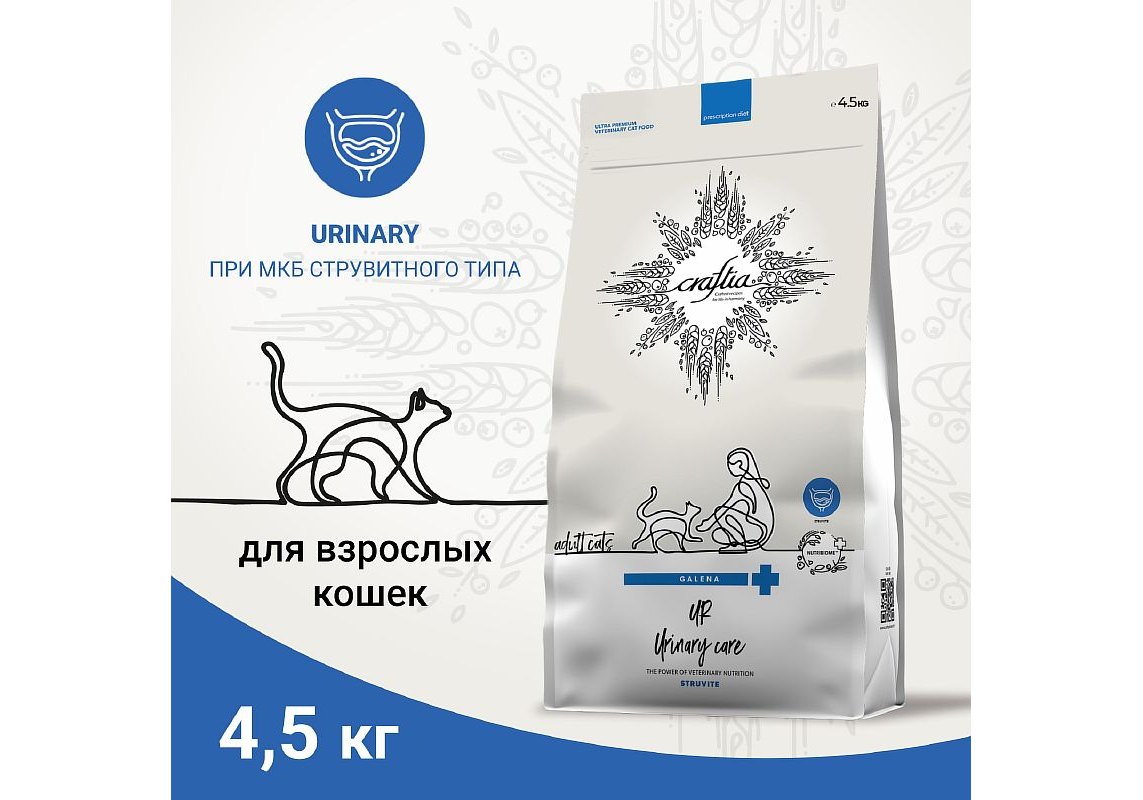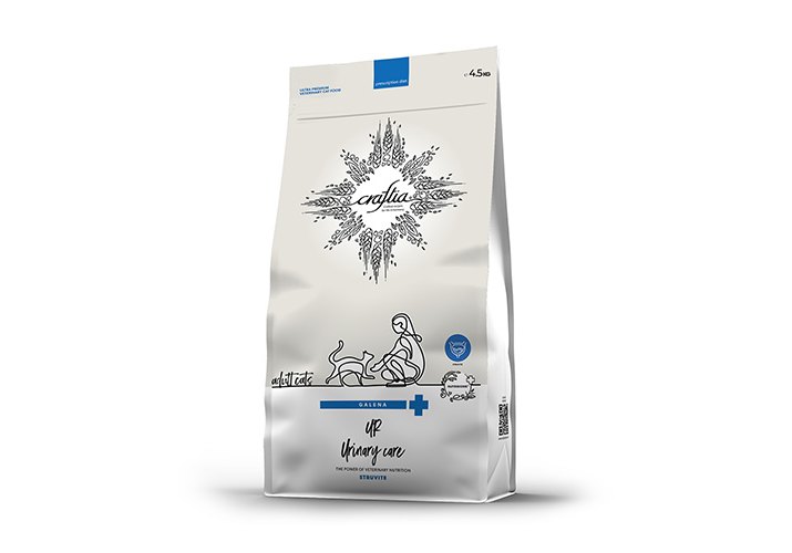 Craftia Galena Urinary Care - полнорационный диетический корм, разработан для растворения струвитных камней в мочевом пузыре и снижения частоты проявления рецидивов. Рекомендован для применения в случаях заболеваний нижних отделов мочевыводящих путей у кошек. Рацион обеспечивает подкисление мочи и имеет низкое содержание магния, что способствует растворению камней. Струвитные камни являются одной из частых причин урологического синдрома у кошек.