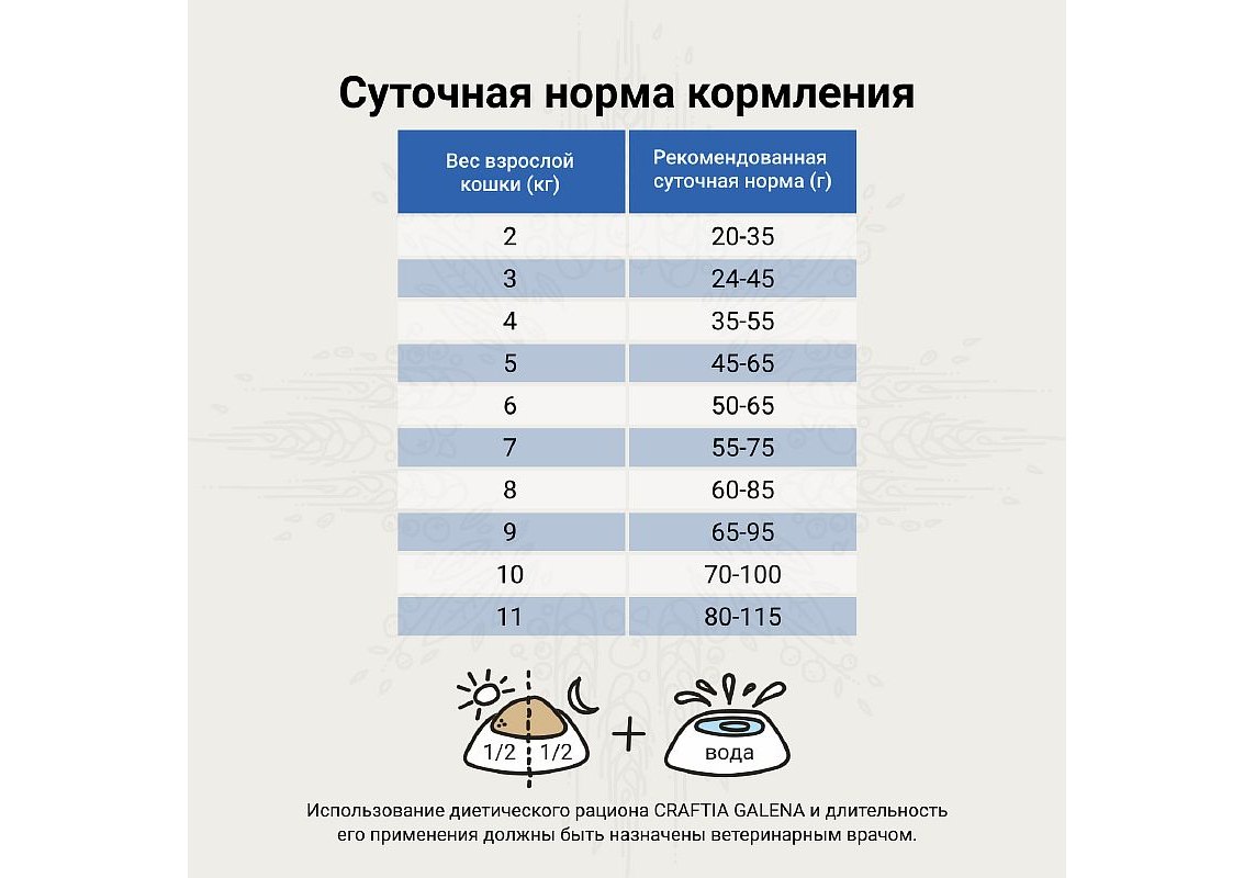 Craftia Galena Gastrointestinal Сare - полнорационный диетический корм для кошек, разработан для помощи при кишечных расстройствах, а также при заболеваниях пищеварительного тракта или при экзокринной недостаточности поджелудочной железы. Это легкоусвояемый корм, который помогает пищеварению, содержит рис, пребиотики и переваримую клетчатку, а также повышенное содержание натрия и калия, которые помогают нормализации формирования стула у кошек.