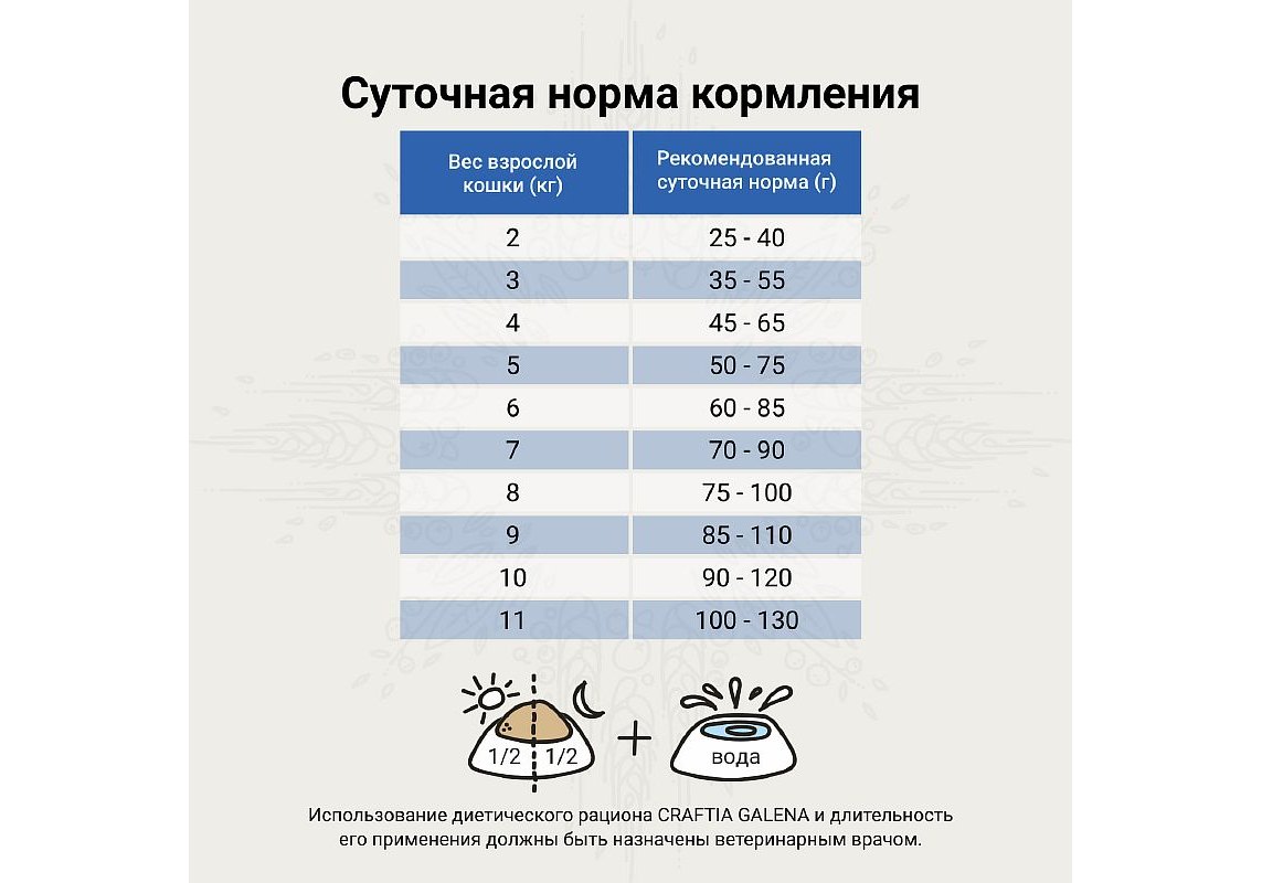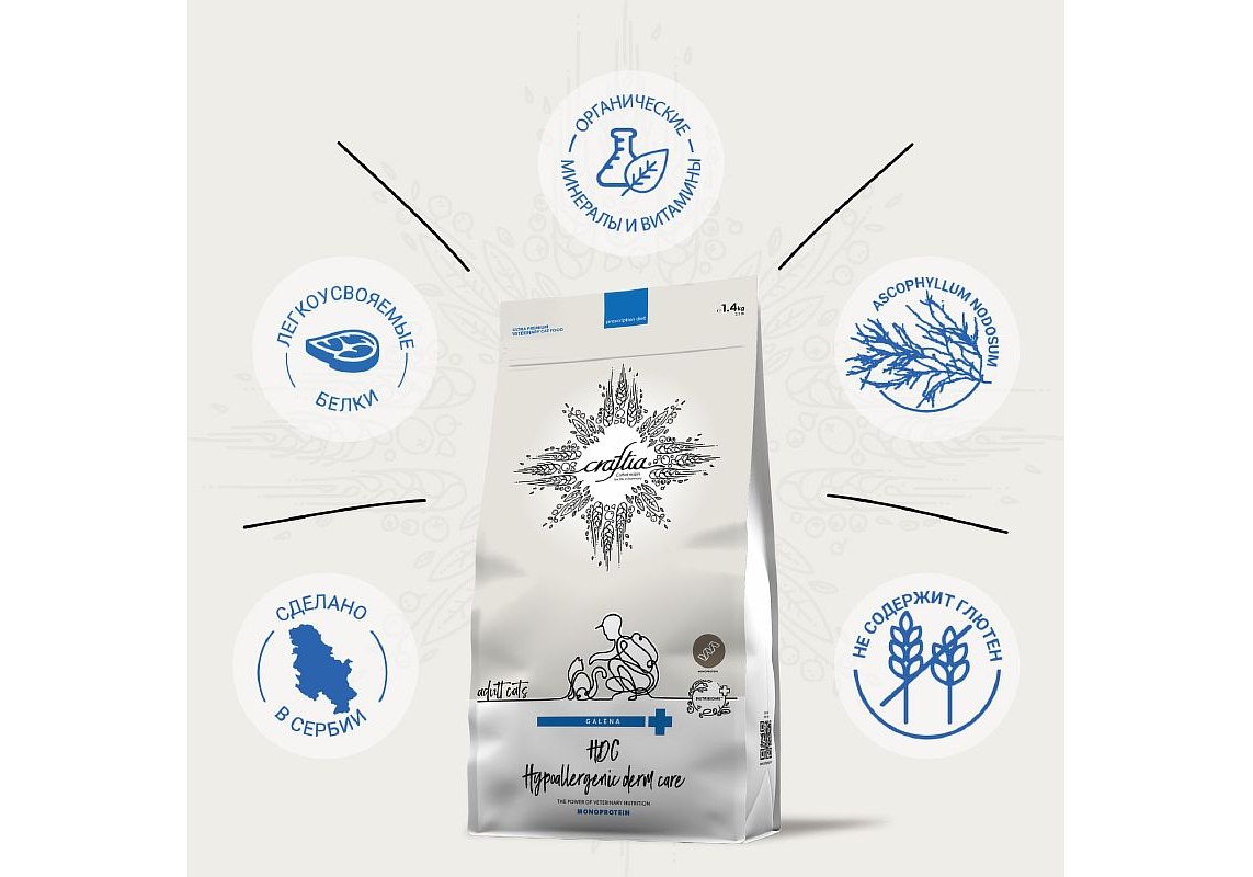 Craftia Galena Hypoallergenic Derm Сare - полнорационный диетический гипоаллергенный корм для кошек, разработан при дерматологических заболеваниях и избыточном выпадении шерсти. Рекомендуется для снижения симптомов непереносимости ингредиентов и питательных веществ (например, при пищевой аллергии), а также, для восстановления нормального функционирования кожи. Рацион имеет монопротеиновую формулу на основе легкоусвояемого гидролизованного рыбного белка и содержит высокий уровень омега-6 и омега-3 жирных кислот (эйкозапентаеновой и докозагексаеновой кислот).