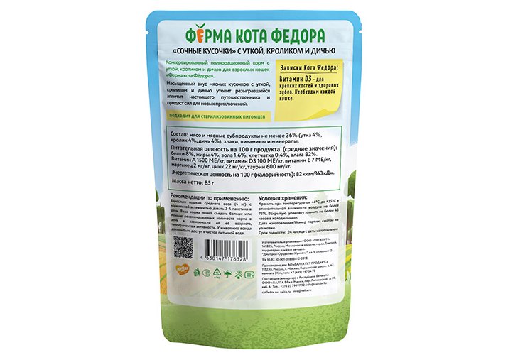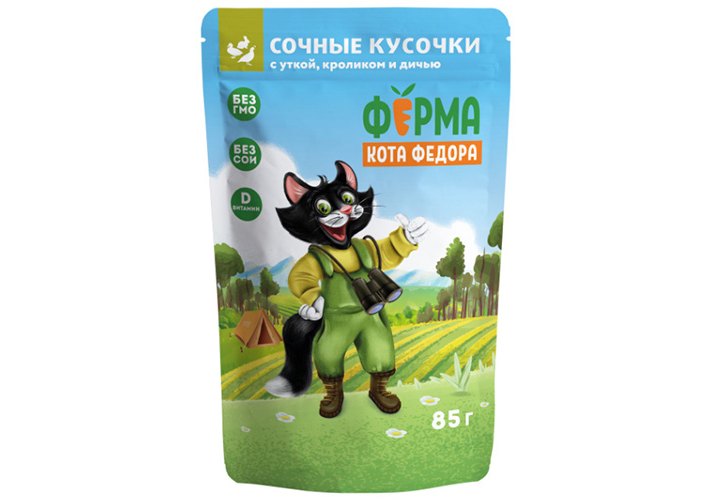 Ферма кота Фёдора Влажный корм Паучи для кошек Мясные кусочки с Уткой, кроликом и дичью (цена за упаковку) 85г х 24шт