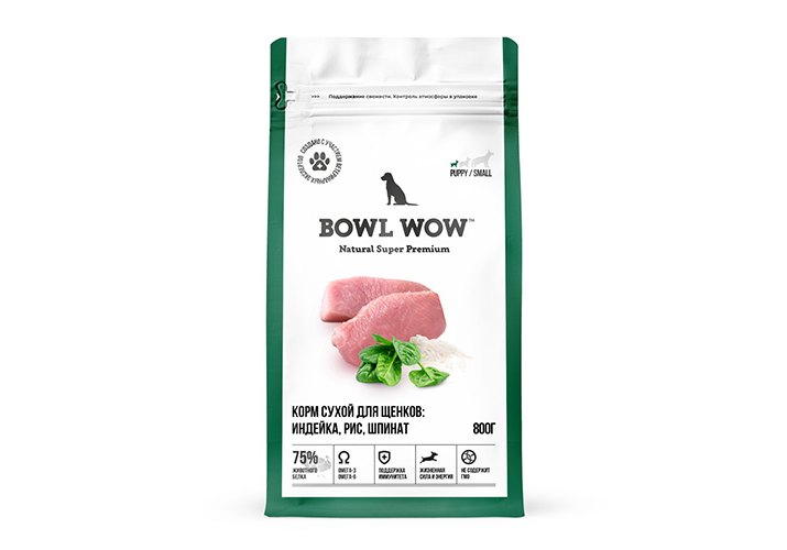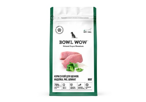 BOWL WOW Puppy Small Сухой корм Боул Вау для Щенков Мелких пород Индейка рис шпинат 800 г