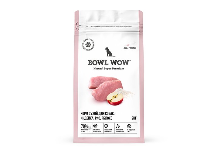 BOWL WOW Adult Medium Сухой корм Боул Вау для взрослых собак Средних пород Индейка рис яблоко 2 кг