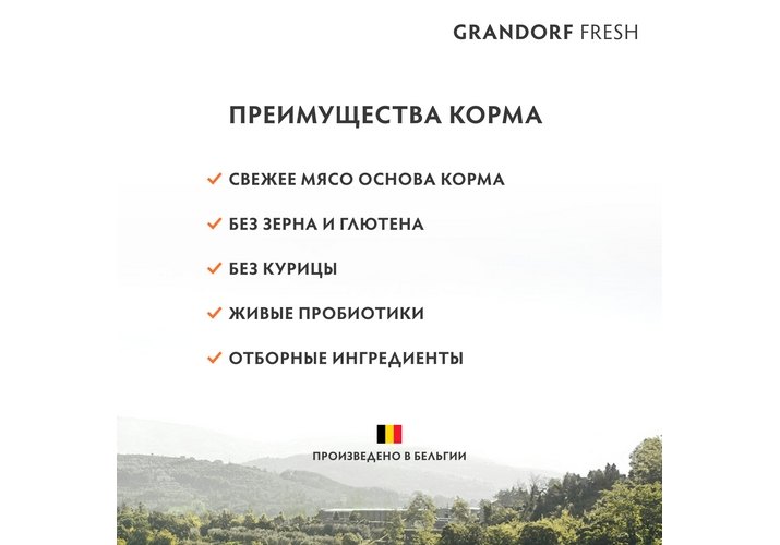 GRANDORF FRESH - беззерновой холистик корм с живыми пробиотиками для кошек и собак, созданный на основе свежего мяса, с овощами, фруктами и ягодами. Без зерна, глютена, субпродуктов и курицы.