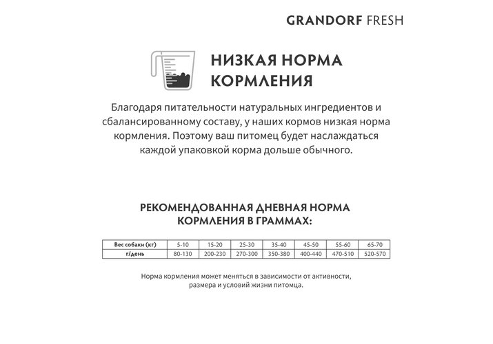 Благодаря беззерновому и безглютеновому составу корма Grandorf FRESH легко усваиваются и отлично подходят для животных с чувствительным пищеварением или пищевой аллергией.