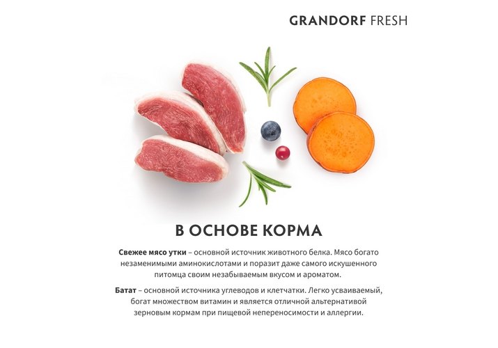GRANDORF FRESH - беззерновой холистик корм с живыми пробиотиками для кошек и собак, созданный на основе свежего мяса, с овощами, фруктами и ягодами. Без зерна, глютена, субпродуктов и курицы.