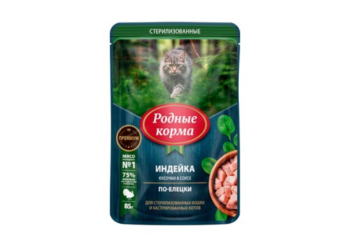 Родные Корма Паучи для кошек с Индейкой кусочки в соусе по-Елецки (цена за упаковку) 85г х 30шт