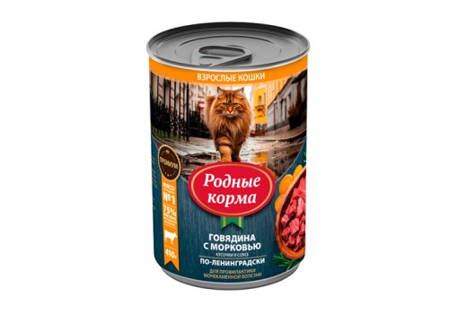 Родные Корма Консервы для кошек с Говядиной и Морковью кусочки в соусе по-Ленинградски (цена за упаковку) 410г х 6шт