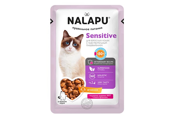 Nalapu Паучи для взрослых кошек с чувствительным пищеварением с ягненком в соусе (цена за упаковку) 77г х 24шт