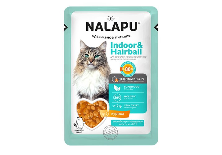 Корм для взрослых кошек, постоянно живущих в помещении. Сочные кусочки с курицей в желе. Способствует выведению шерсти из ЖКТ