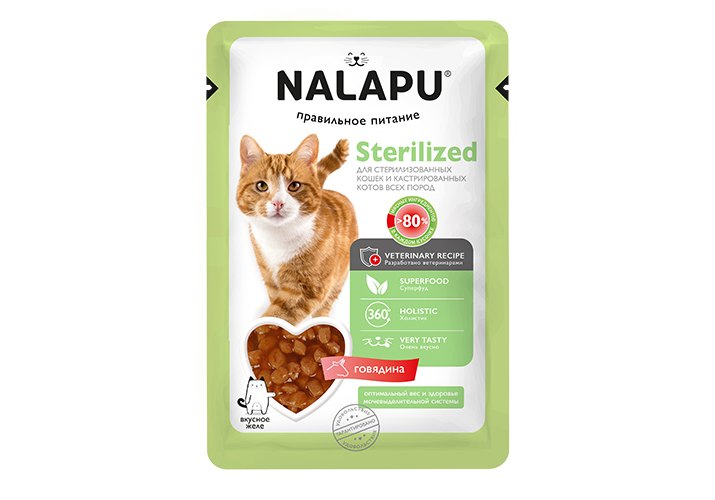 Nalapu Паучи для стерилизованных кошек и кастрированных котов с говядиной в желе (цена за упаковку) 77г х 24шт