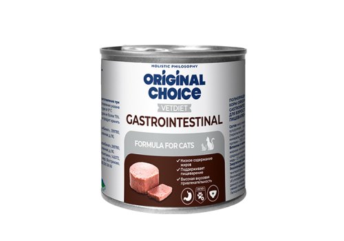 Полнорационный консервированный корм ORIGINAL CHOICE VETDIET Gastrointestinal предназначен для кошек с чувствительным пищеварением. Специально разработанное диетическое питание с легкоусвояемым мясом средней жирности курицы и индейки поможет справится с дискомфортом во время болезни и подойдет в качестве профилактики болезней ЖКТ.