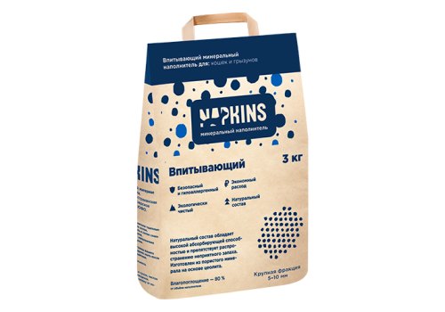 Впитывающий наполнительNapkinsизготовлен из пористого минерала на основе цеолита. Натуральный состав обладает высокой абсорбирующей способностью и препятствует распространению неприятного запаха.