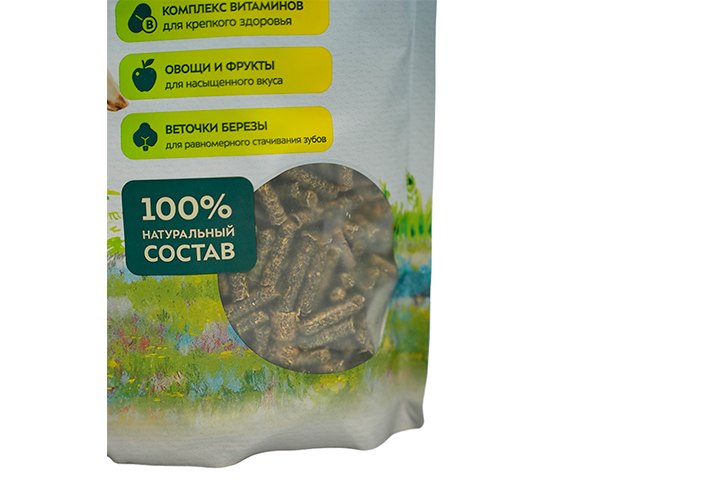 В состав рациона входит комплекс витаминов для крепкого здоровья, овощи и фрукты для насыщенного вкуса, веточки березы для равномерного стачивания зубов.