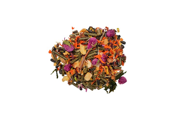 гранулы из смеси трав (райграсс, тимофеевка, мятлик), мультивитаминные гранулы (зернопродукты, травяная мука, свекловичный жом, дрожжи, витаминно-минеральный премикс), гранулы из люцерны, плющеный горох, семечки подсолнечника, кусочки кэроба, морковь, свекла, чипсы банана, паприка, цуккини, сушеный лук, сушеные яблоки, цветы клевера, березовые веточки, ламинария, юкка шидигера, комплекс пробиотиков, натуральный адсорбент – дрожжи (S.cerevisae).