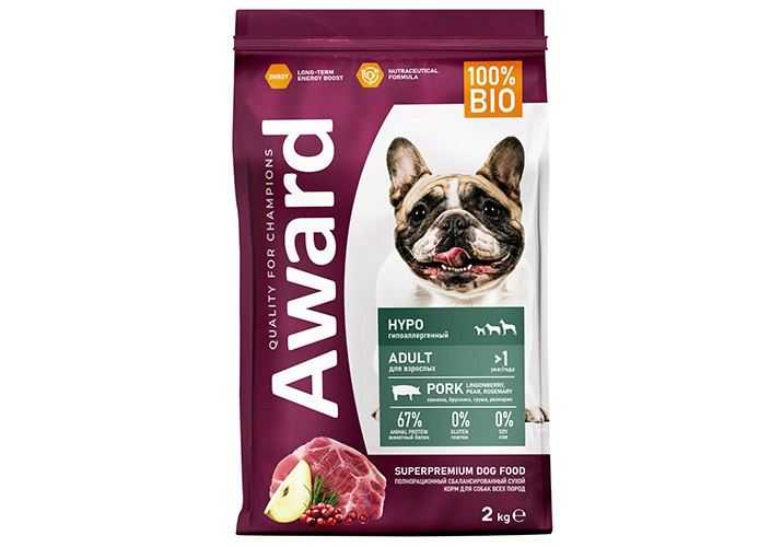Сухой корм AWARD HYPO для взрослых собак всех пород со свининой с добавлением брусники, груши и розмарина 2 кг.