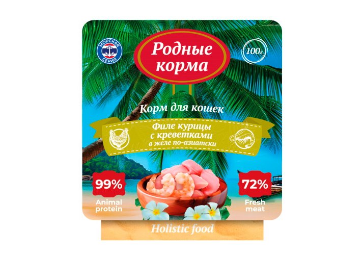 Откройте для своего пушистого друга мир морских деликатесов с новой линейкой влажных кормов Родные корма «Морская серия» филе курицы с креветками в желе по-азиатски!