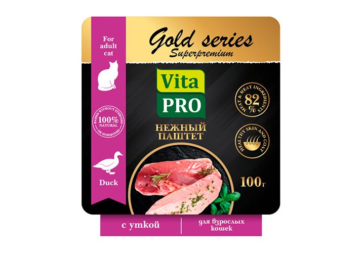 Откройте мир суперпремиального влажного корма в виде нежного паштета для взрослых кошек с уткой VITA PRO GOLD series Superpremium в ламистерах!
