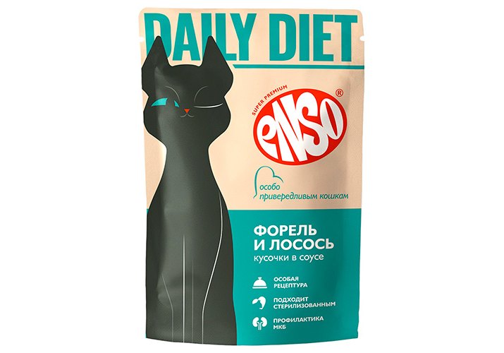 ENSO® DAILY DIET Полнорационный влажный профилактический корм для взрослых кошек, кусочки с форелью и лососем в соусе.