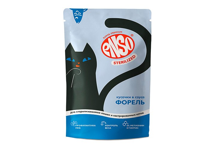 ENSO Sterilized Полнорационный консервированный корм для стерилизованных кошек и кастрированных котов, кусочки с форелью в соусе.