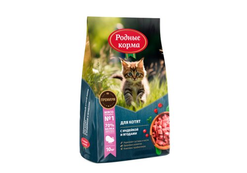 Родные Корма Сухой корм для котят с Индейкой и ягодами 10 кг