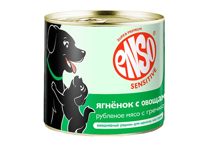 ENSO SENSITIVE Полнорационный влажный корм для поддержания активного роста и развития щенков ягненок с овощами. Рубленое мясо с гречкой.