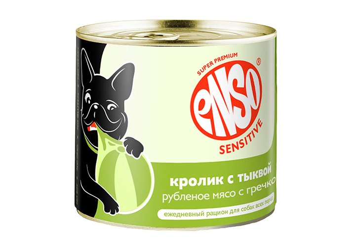 ENSO SENSITIVE Полнорационный влажный корм для поддержания здоровья ЖКТ взрослых собак кролик с тыквой. Рубленое мясо с гречкой.