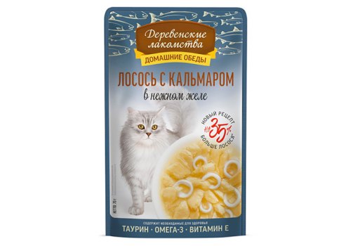 Деревенские лакомства Домашние обеды Паучи для кошек Лосось с Кальмаром в нежном желе (цена за упаковку) 70г х 12шт