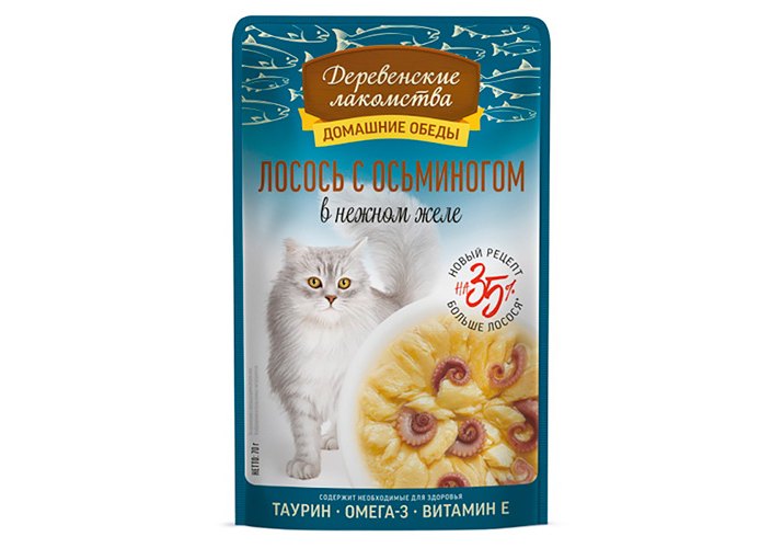 Деревенские лакомства Домашние обеды Паучи для кошек Лосось с Осьминогом в нежном желе (цена за упаковку) 70г х 12шт