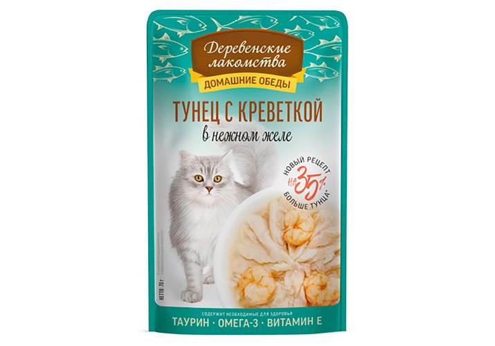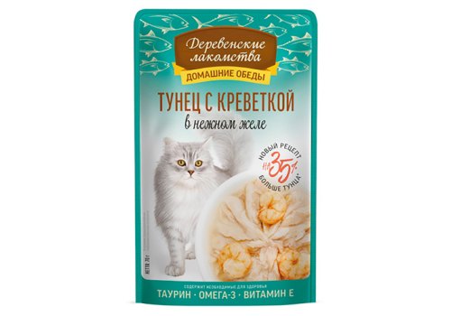 Деревенские лакомства Домашние обеды Паучи для кошек Тунец с Креветкой в нежном желе (цена за упаковку) 70г х 12шт