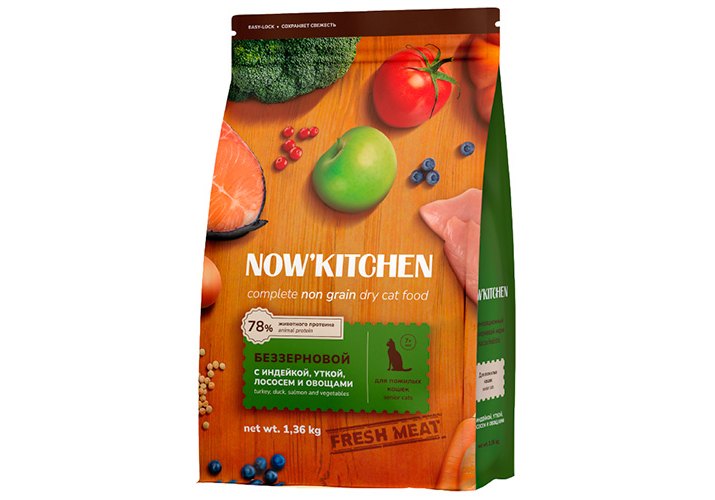 Полностью сбалансированный корм класса холистик NOW'KITCHEN полнорационный беззерновой сухой корм для пожилых и склонных к полноте кошек.