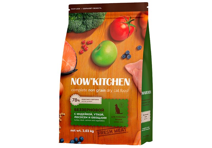 Полностью сбалансированный корм класса холистик NOW'KITCHEN полнорационный беззерновой сухой корм для пожилых и склонных к полноте кошек.