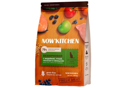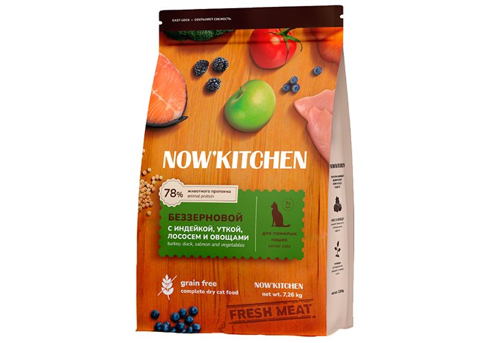 Полностью сбалансированный корм класса холистик NOW'KITCHEN полнорационный беззерновой сухой корм для пожилых и склонных к полноте кошек.
