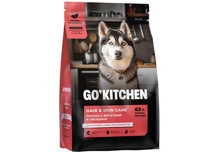 GO'KITCHEN HAIR+SKIN CARE Salmon - полнорационный корм для щенков и собак всех возрастов, разработанный специально для поддержания здоровья кожи и шерсти.