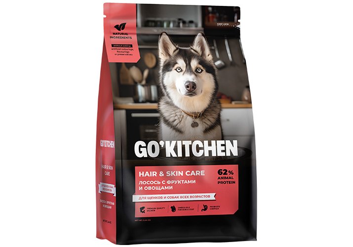 GO'KITCHEN HAIR+SKIN CARE Salmon - полнорационный корм для щенков и собак всех возрастов, разработанный специально для поддержания здоровья кожи и шерсти.