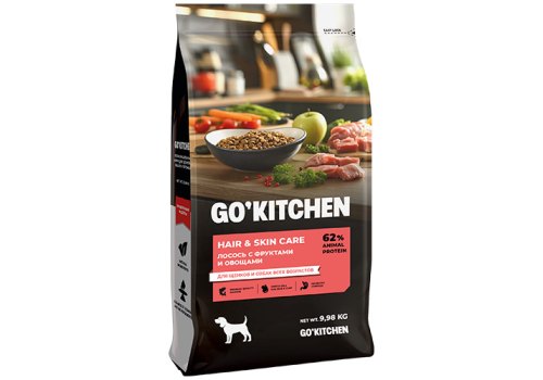 GO'KITCHEN HAIR+SKIN CARE Salmon - полнорационный корм для щенков и собак всех возрастов, разработанный специально для поддержания здоровья кожи и шерсти.