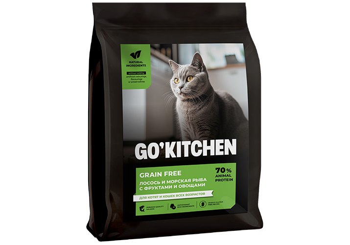 GO'KITCHEN GRAIN FREE Salmon&Seafish - беззерновой корм, разработанный с учетом потребностей котят и кошек всех возрастов, обеспечивающий полноценное питание, насыщенное пользой натуральных ингредиентов.