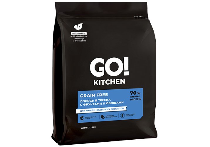 GO'KITCHEN GRAIN FREE Salmon&Seafish - беззерновой корм, разработанный с учетом потребностей котят и кошек всех возрастов, обеспечивающий полноценное питание, насыщенное пользой натуральных ингредиентов.