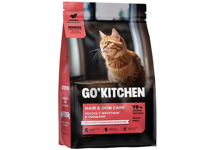 GO'KITCHEN HAIR+SKIN CARE Salmon - специальная формула с высоким содержанием мясных ингредиентов, цинком и льняным семенем для здоровой кожи и блестящей шерсти.