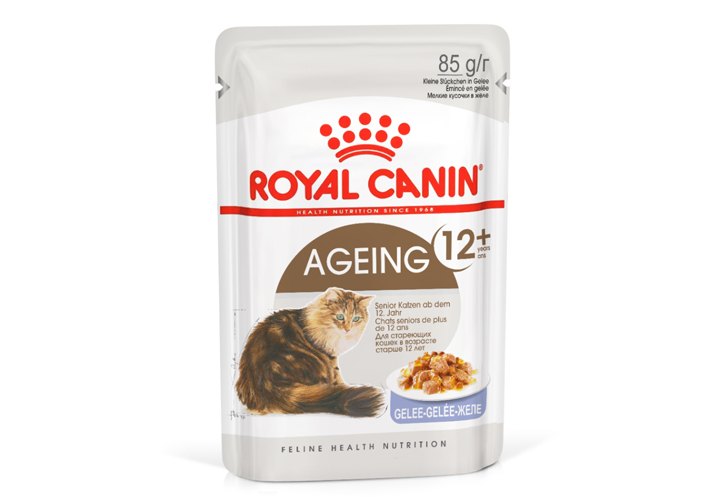 Корм консервированный полнорационный для стареющих кошек в возрасте старше 12 лет AGEING 12+ (ЭЙДЖИНГ 12+) ROYAL CANIN®, мелкие кусочки в желе, подходящий для стареющих кошек в возрасте старше 12 лет, специально разработан с учетом потребностей вашей кошки в питательных веществах.